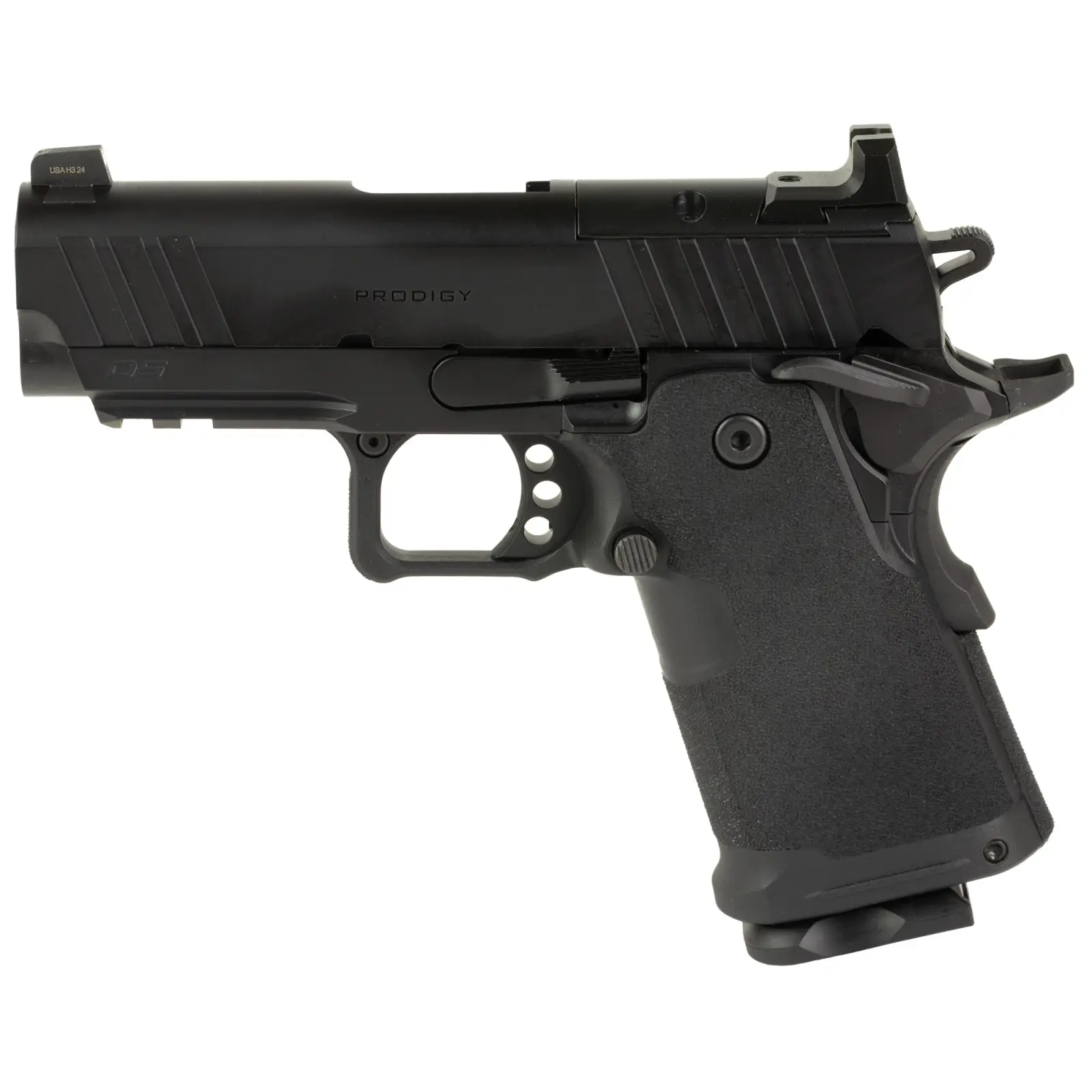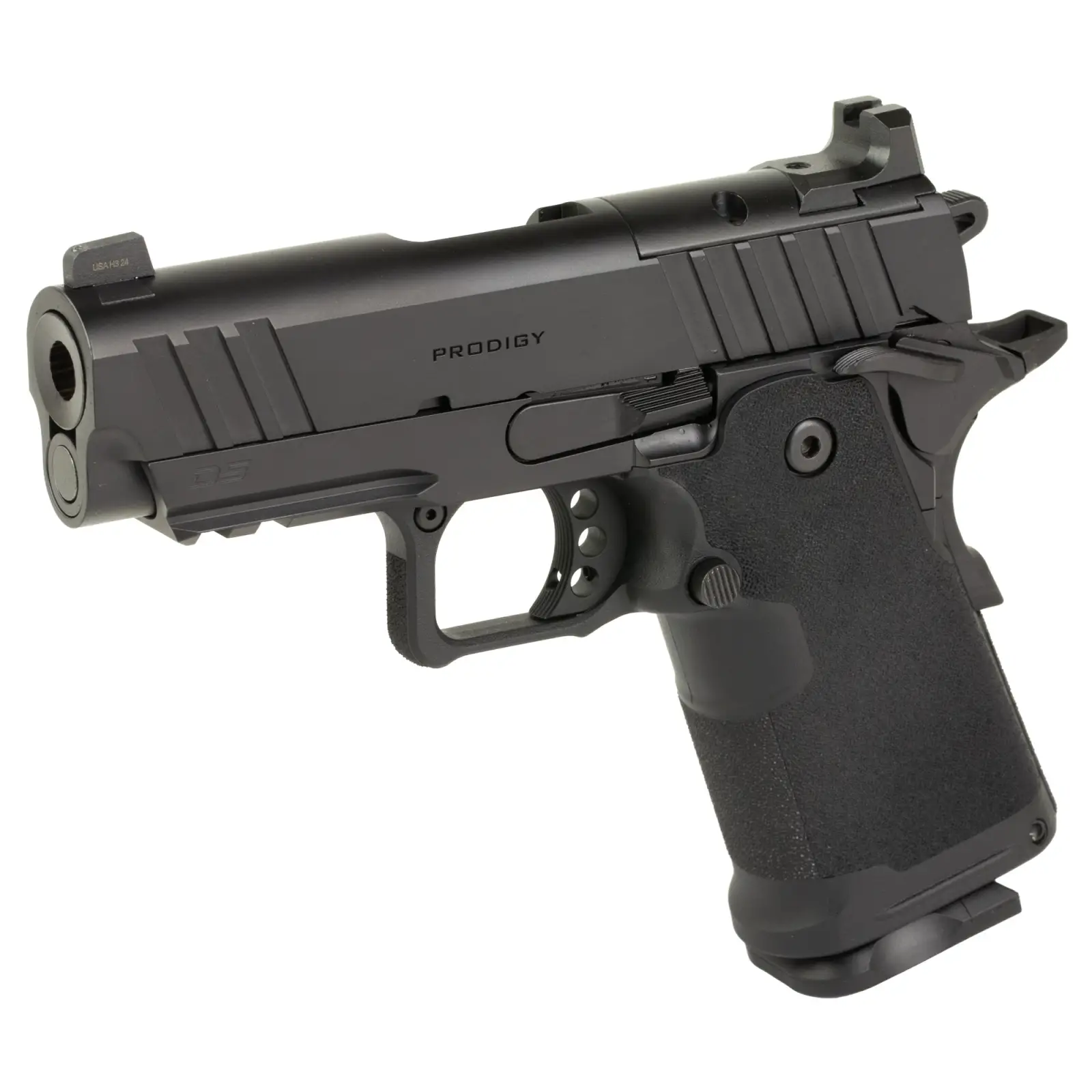 Constructed with a durable aluminum alloy frame and a compact polymer grip module, the Prodigy Compact is lightweight yet rugged. It features a bull barrel for increased accuracy and reduced muzzle rise, while the shortened beavertail and recontoured hammer help minimize the profile for comfortable carry. The single-action trigger and extended ambidextrous thumb safety provide confident, responsive control.