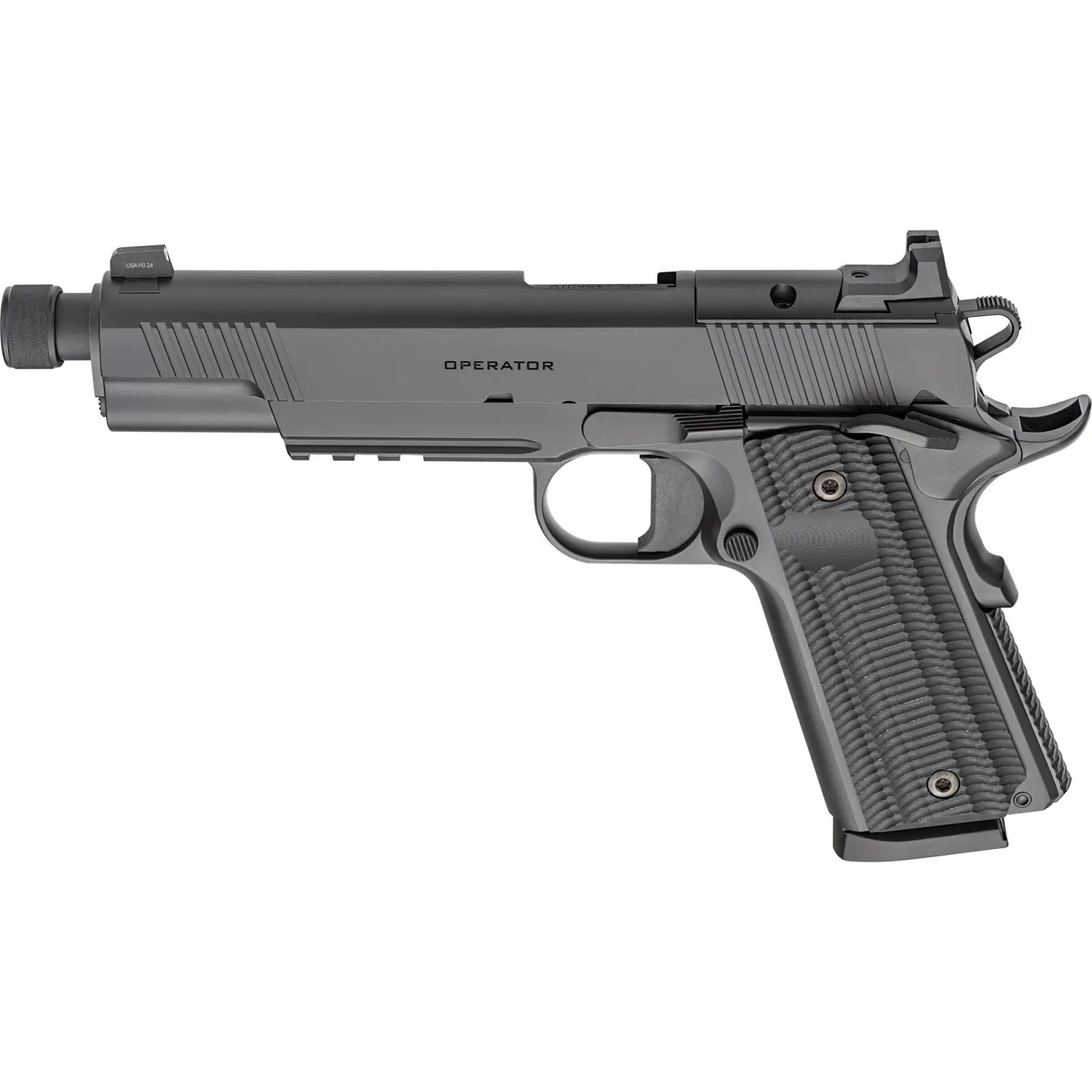 Springfield, Operator AOS, 1911, Single Action Only, Semi-automatic, Metal Frame Pistol, Full Size, 45ACP, 5.75" Barrel, Threaded .578X28, Cerakote Finish, Black, Optics Ready Slide, VZ G10 Grips, Tritium Front Sight, Serrated Black Rear Sight, Ambidextrous Thumb Safety, 8 Rounds, 2 Magazines