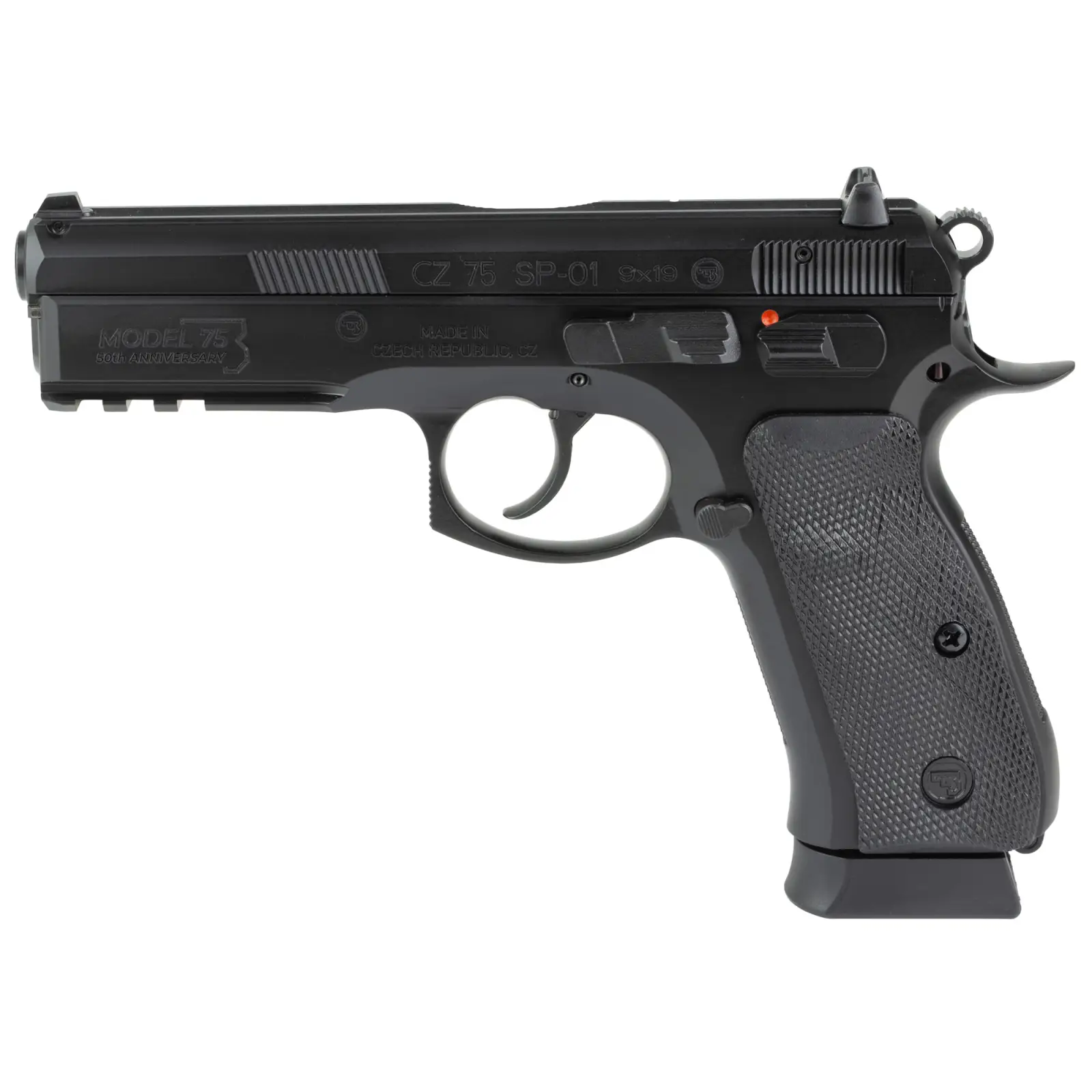 CZ, 75 SP-01 50th Anniversary Elite, Double Action/Single Action, Semi-automatic, Metal Frame Pistol, Full Size, 9MM, 4.6" Cold Hammer Forged Barrel, Steel, Polycoat Finish, Black, Manual Safety, Rubber Grips, Fixed Sights, 19 Rounds, 2 Magazines