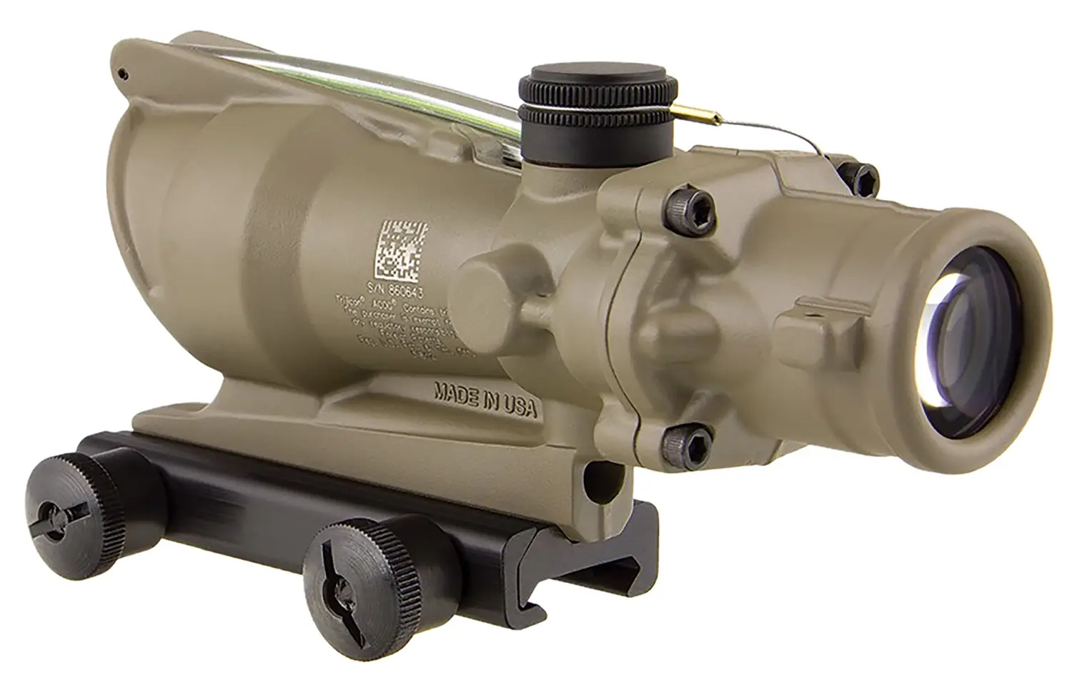 ACOG 4x32 BAC Riflescope FDE - .223 / 5.56 BDC - Green Crosshair Reticle - Thumbscrew Mount - Tritium / Fiber Optics Illum. - The 4x32 ACOG scope provides a dual-illuminated reticle using fiber optics and tritium for a bright aiming point in any light con