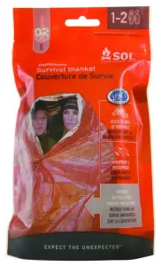 The SOL (Survive Outdoors Longer) Survival Blanket is meticulously designed never to fail when you're counting on it with your life. The vacuum-metalized polyethylene material is compact and lightweight (3.5 oz.), sized to fit two people, and reflects 90% of body heat. Unlike traditional blankets, will not shred if nicked or punctured and rips and tears can be repaired. It is waterproof, quiet and won't crinkle in high winds, and its high-visibility orange exterior makes it easy for rescuers to find you. This blanket is a true ultralight multifunction tool that can also be used as a ground cloth, gear cover, first aid blanket, and more. Survival instructions are printed directly on the blanket for easy reference.