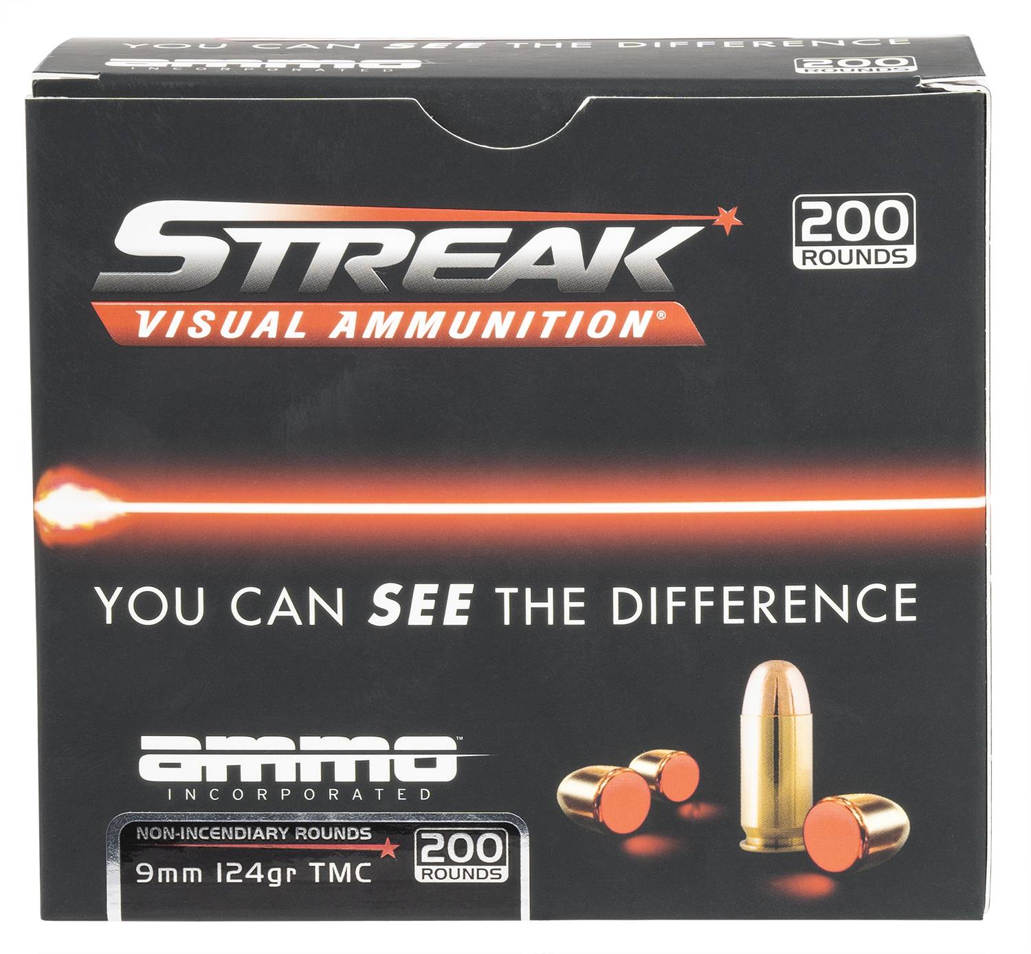 Caliber: 9mm - Bullet Type: total metal - Bullet Weight: 124 gr - Application: Target - Muzzle Velocity: 1065 fps. - Ammo Inc. STREAK Visual Ammunition