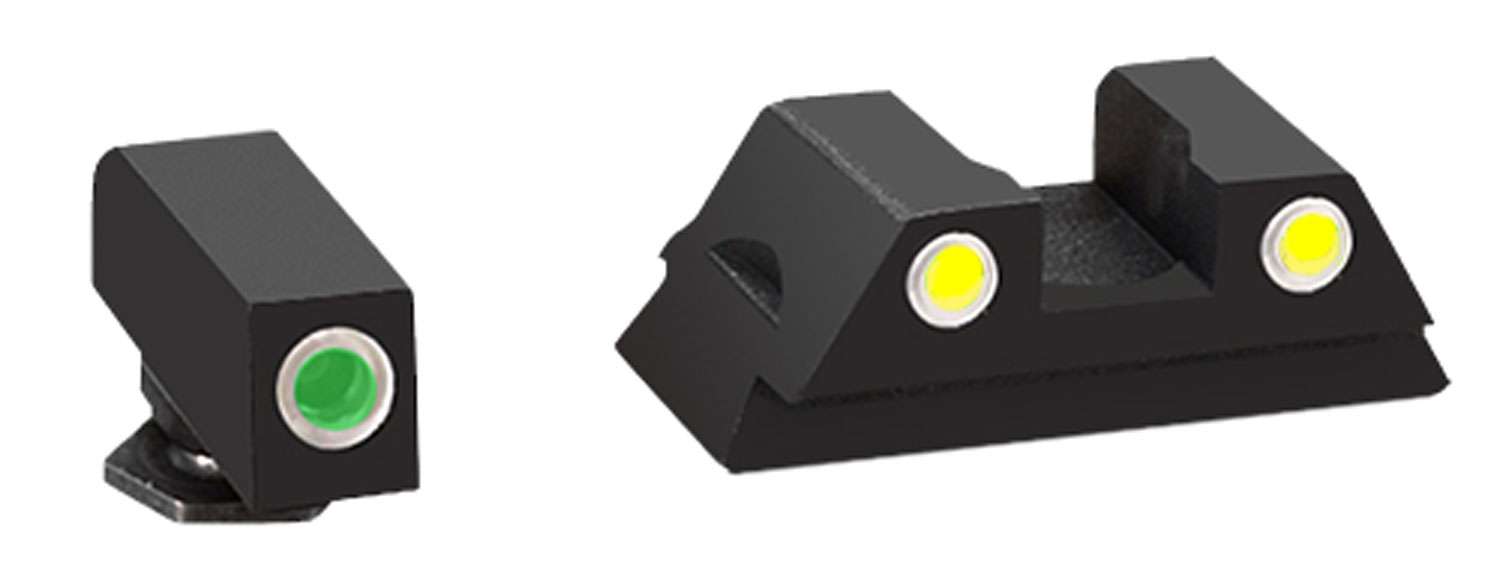 This model has green tritium with white outline, yellow tritium with white outline rear, and a black frame. It is compatible with Glock 42/43.
