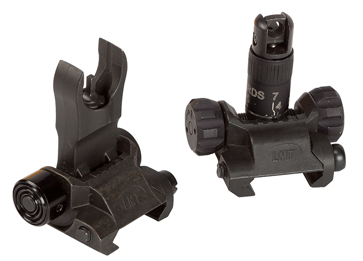 Front and rear flip sight for 5.56 caliber. These sights were designed to be used in all conditions. The front sight has an internal clutch to allow the front sight to flex, but also collapses with increased force. The sight stays up with small pressure, but collapses down when pressured for safety. This keeps the sight up when needed and collapses before breaking off.