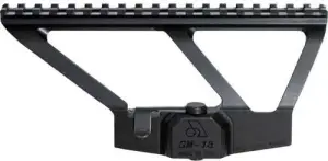The SM-13 low profile scope mount utilizes the time-proven steel adjustable locking mechanism which allows instantaneous attachment and release of the scope mount. It attaches to the side scope rail of an AK variant rifle, which provides the most stable attaching platform on the rifle. The 7.5-inch Picatinny rail allows for attaching multiple devices and the relief cut along the rail allows the use of iron sights. It is also machined from aircraft grade aluminum alloy with a black finish.