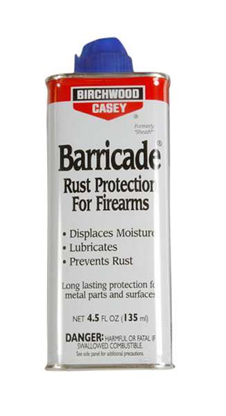 Birchwood's Barricade Rust Protection protects your firearms from rust. It rapidly drives out moisture from metal pores and deposits a transparent coating which seals the surface with a protective film. It is also an excellent penetrant for loosening rusty or frozen parts, as well as a good lubricant and an effective bore cleaner. Contains FPR to wipe off corrosive fingerprints on all your firearms.