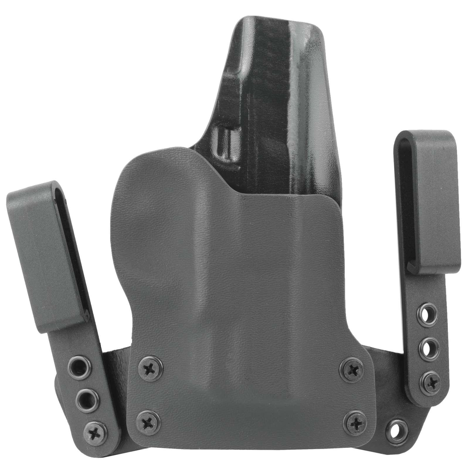 The Mini Wing is designed to be minimalistic. It uses as little material as possible, without sacrificing performance or durability. Dedicated to maintaining a thin profile, this holster allows for deep concealment matched with ultimate comfort. The pairing of Kydex and leather allows for the Kydex to reliably retain your pistol without a break in or wear out period. In addition, the Kydex shell prevents the holster from collapsing when your pistol is drawn, and remains open for easy one handed holstering. The leather mini wings are incorporated to allow the holster to wrap around the contours of your waist, allowing for a versatile fit for all body types. The mini wings give the holster flexibility to move with your body, making it comfortable for use all day, every day. The mini wings were constructed to provide the user with a variety of different configurations for IWB carry as well as a wind range of cant and ride height adjustments. This provides the user with a variety of available carry positions around the waist, from appendix, all the way to the small of the back. Thread Locker is applied to all screws to prevent loosening over time. Ride height and cant can be adjusted by changing the position of the IWB loops and wings. Made in the USA.