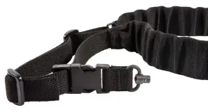 Blue Force Gear's DDC Padded Bungee Single Point Sling is both fast and comfortable. It is constructed of Invista Cordura webbing with a 2-inch inline padding and bungee sections for extra comfort. The bungee has a travel of approximately 2-inches which is enough to absorb shock from movement or transitions but short enough to reduce the risk of facial injuries or sagging weapons. The overall length is adjustable, ambidextrous, and compatible with use over body armor. This model has a black finish and comes with a push button adapter. It is compatible with weapons with push button sling swivel sockets found on receivers, end plates, stocks, or adapters. NOTE: It is not advised to connect the UDC Sling at the buttstock as this may hang the weapon too low for proper use.