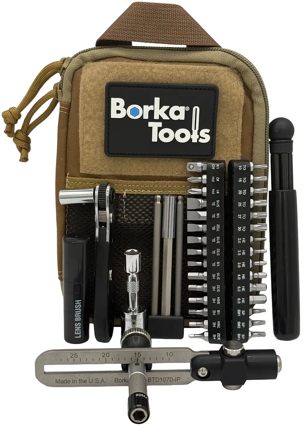 Borka Enhanced Configuration Tool Kit with Emergency Cleaning Rod. Precision, Portability, Field-Ready Cleaning, the Borka is the ultimate field service kit. It combines the full versatility of the Extended Configuration (BTK-E1) with the added security of a compact, modular Emergency Cleaning Rod (ECR) a tool for rapid obstruction removal and quick bore maintenance in the field or at the range. All-in-One Professional Kit: Every BTK-E5 includes all the components of the BTK-E1, plus the premium Borka/Pro-Shot Emergency Cleaning Rod. Inside the rugged Cordura nylon pouch youll find: Adjustable Torque Driver, Torque calibration accuracy: 4%, Compact Ratchet Handle: 1/4" hex (F) x 1/4" square drive (M), Adapters & Extensions: 1/4" hex drive (F) to 1/4" square drive (F) adapter, 1/4" hex drive (M) to 1/4" square drive (M) adapter, 2" extension with 1/4" square drive (M and F) ends, 4" long bit extension (0.4" O.D. max). Extended-Length Custom Bits: 5/32" ball-end hex 4" long bit, 3/16" ball-end hex 4" long bit (Universal AICS bit). Premium S2 Tool Steel Chrome-Plated Bits (29 total): Hex, Inch: 3/32, 7/64, 1/8, 9/64, 5/32, 3/16. Hex, Metric: 2, 2.5, 3, 4, 5, 6. Slotted: 1/8, 5/32, 3/16, 7/32, 1/4, 5/16. Torx: T-10, T-15, T-20, T-25, T-27, T-30. Phillips: #1, #2. Spare Torx Bits: T-10, T-15, T-20 (stored in labeled Special Bits slots SPB#13). Additional Essentials: Mohair lens brush, instruction guide sheet with quick-start info and video links. Emergency Cleaning Rod (ECR) Field-Ready & Modular Configured by Borka Tools using Pro-Shot Products rods, the ECR delivers unmatched reliability in a compact package: Seven Pro-Tuff coated rod sections: (each 4.5" usable length) assemble to a total 31.5" length. Micro-Polished Stainless Steel with Pro Tuff Coating: tough yet softer than barrel steel to prevent damage; chemical- and heat-resistant for maximum bore protection. Brass Obstruction Remover: 0.5" long, 0.203" O.D.; essential for clearing stuck cartridge cases or bore obstructions. Ball Knob with Rubber Buffer: 0.75" diameter; protects muzzle and ensures a secure grip. Perfect for: Emergency removal of bore obstructions, Quick patch-cleaning with oiled or dry cloths, Field extraction of spent cartridge cases. Weight: Approx. 1 lb. 13 oz. Pouch Size: Approx. 8" x 5.5" x 2"