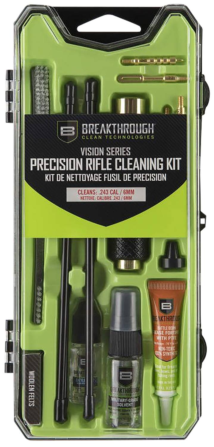 Breakthrough Clean Technologies Vision Series .243/ 6mm Rifle Cleaning Kit offers you everything you need to ensure a thorough clean. Its plastic tray keeps all the various pieces of the kit organized neatly inside a durable case that acts like a mini toolbox. This compacted cleaning kits come with cleaning rod sections, various hard bristle nylon brushes, jags, patch holders, and cotton patches. Also included is a durable and detachable aluminum handle with knurling for an easy grip and a mini bottles of Breakthrough Military-Grade Solvent and Battle Born High-Purity Oil.