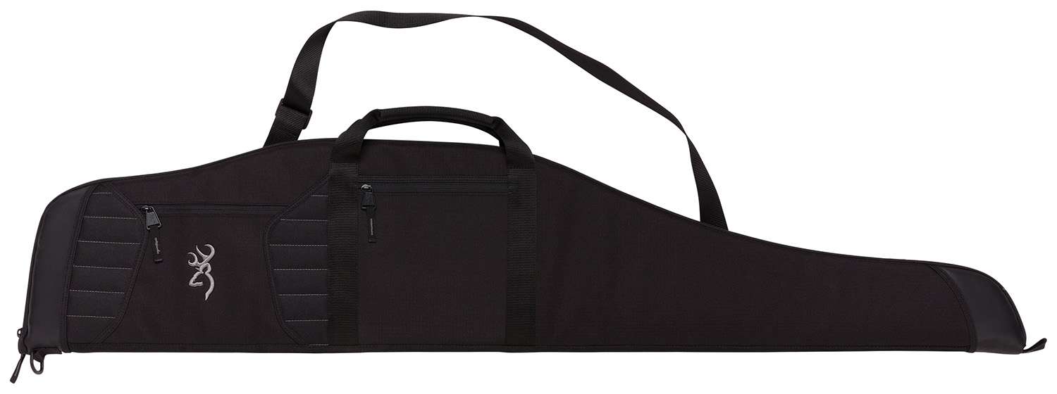 Tough scoped rifle case with polyester canvas exterior and reinforced muzzle cap. Large, high profile shape is designed for scoped firearms. Three pockets with zipper closures.