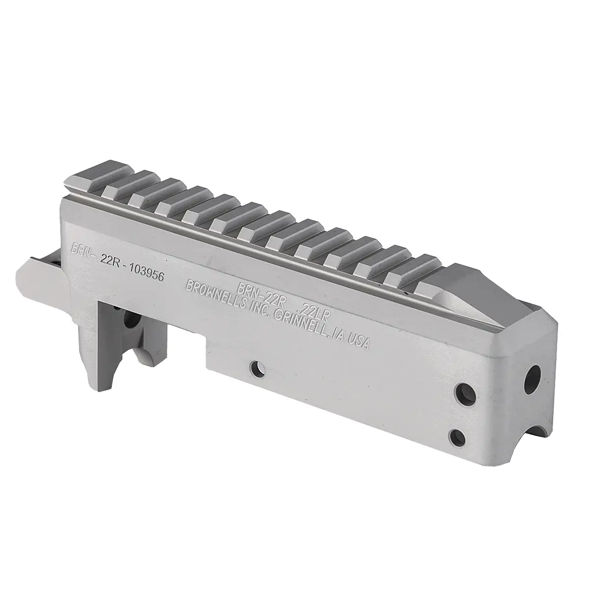 The Brownells BRN-22 Receiver is ready to be the foundation of your custom rimfire rifle build. Each BRN-22 receiver is precision-machined from 6061 aluminum billet to exacting tolerances. Why machined instead of forged, like most commercial receivers? All you need to do is look inside at the smooth, clean interior to realize that a machined receiver can be held to much tighter tolerances for a precise fit with other parts. After machining, BRN-22 receivers get a tough matte black Type 2 hardcoat anodized finish (like the finishes found on many AR-15 receivers). There’s even a pre-drilled cleaning rod hole at the rear of each Brownells BRN-22 receiver for easy cleaning of the bore from the chamber, the PROPER way to prevent a cleaning rod from damage to the muzzle crown that can compromise accuracy.