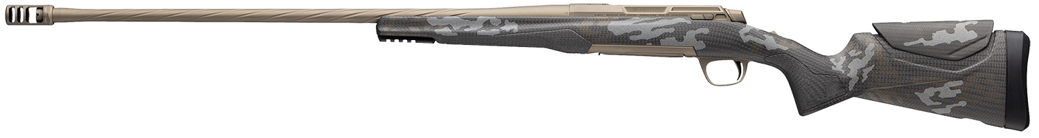 The X-Bolt 2 Mountain hunting rifle features a carbon fiber stock with a compression molded carbon fiber bedding block and accent graphics; Cerakote Tungsten finish on a spiral fluted, threaded barrel with a threaded muzzle; redesigned receiver and bolt; stainless steel receiver w/X-Lock scope mounting system and easy to reach top tang safety. Includes Recoil Hawg muzzle brake and thread protector.