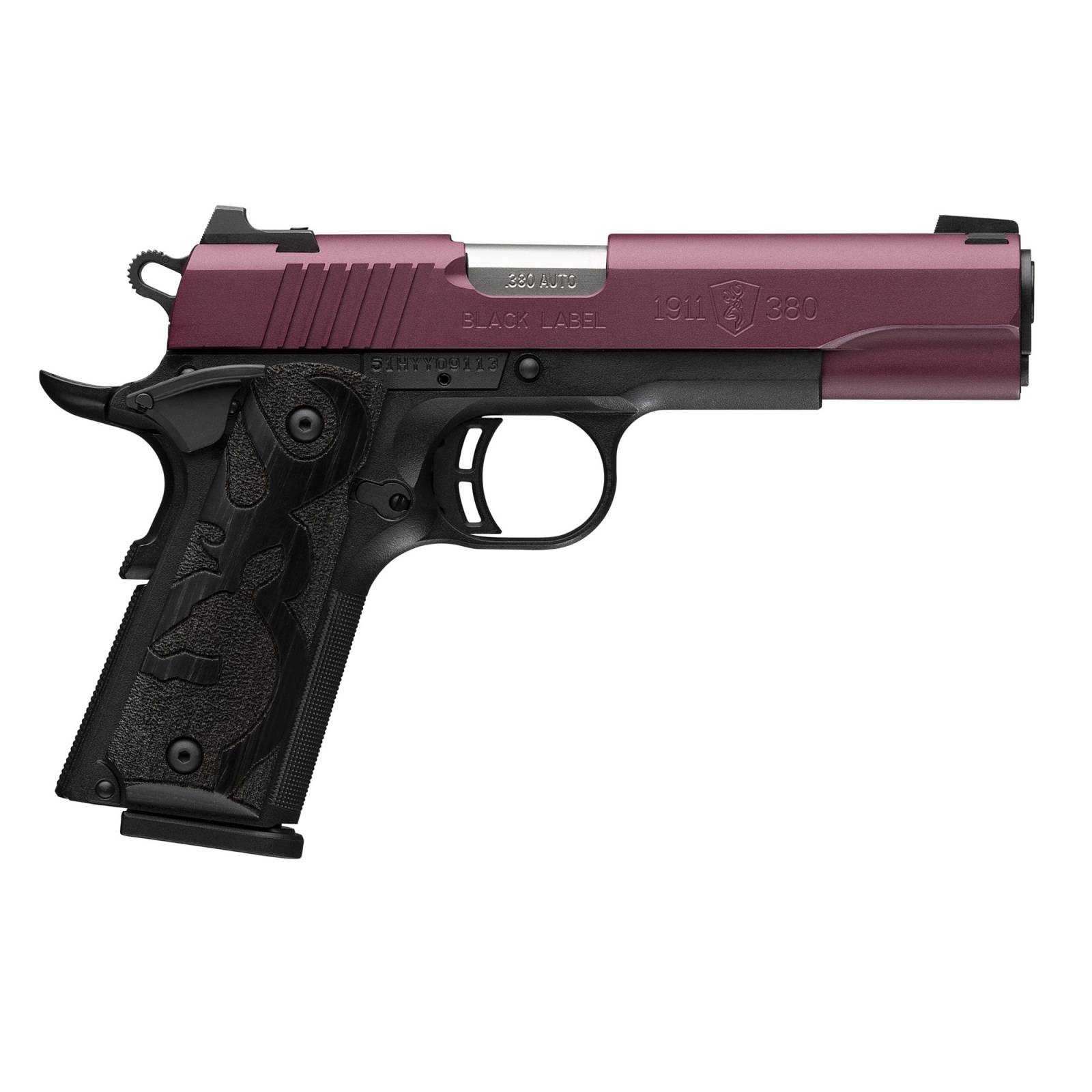 Browning, Black Label, 1911, Single Action, Semi-automatic, Metal Frame Pistol, Full Size, 380 ACP, 4.25" Barrel, Cerakote Finish, Black Cherry, Black Frame, Stippled Laminated Wood Grips, 3 Dot Sights, 10 Rounds, 2 Magazines