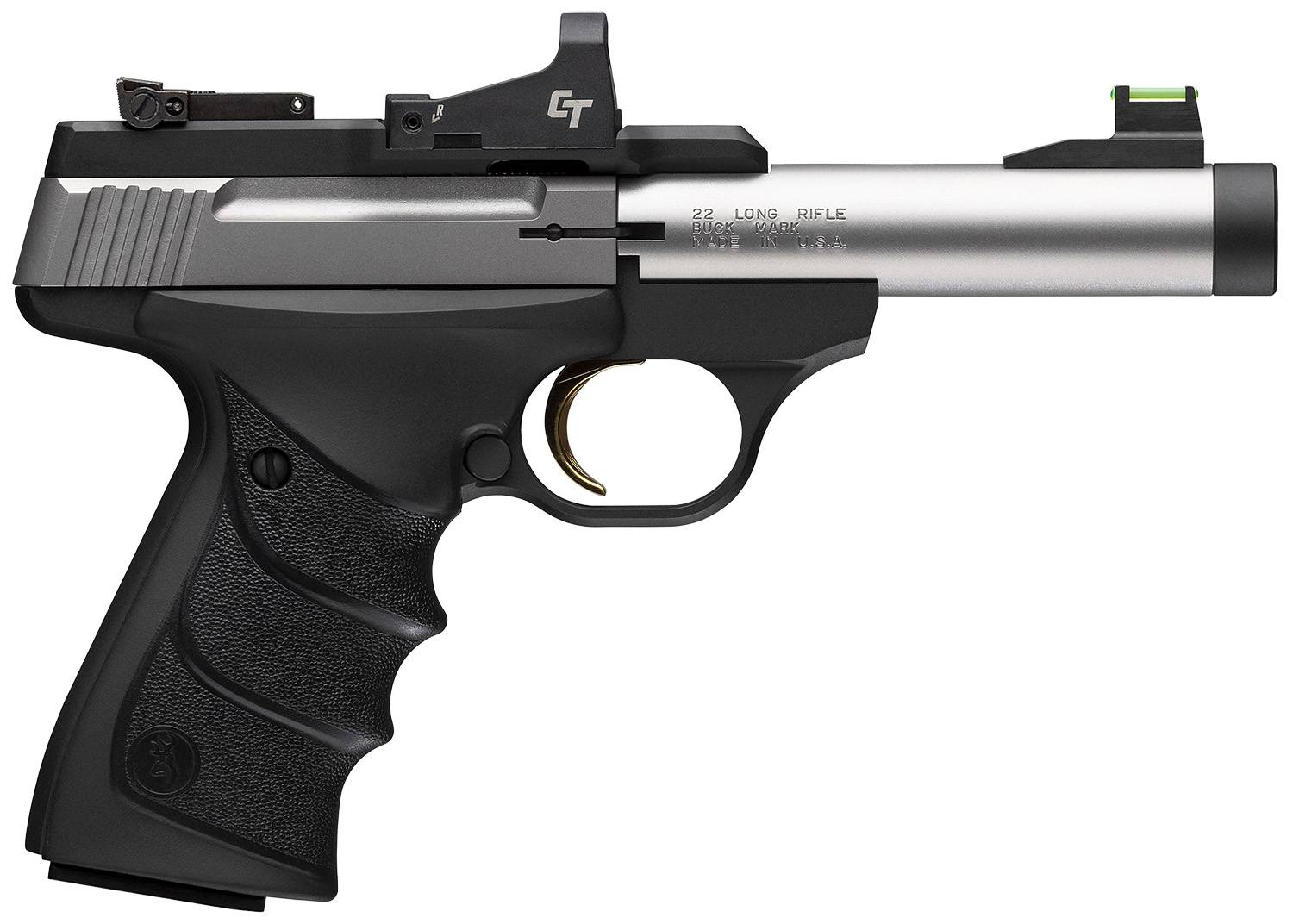 Browning Buck Mark Micro Bull SR features 4" matte black stainless threaded, Bull barrel; rubber overmolded URX ambidextrous grips; Crimson Trace Red Dot sight; green fiber optic front sight, adjustable rear sight and 1/2"-28 suppressor ready threads.