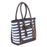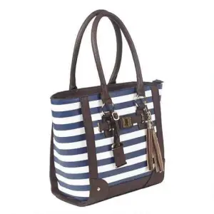 Bulldog's Tote style purse is designed to fit most small autos and revolvers. It features an universal fit, color matched holster and is made from durable leather. This purse's dimensions are 17" x 12" x 5" and has a Navy stripe finish.
