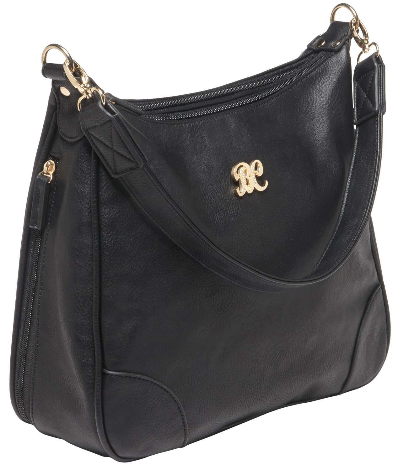 Designed for left or right handed use, this Hobo style purse is made of attractive durable leather. It has a color matched holster made to fit most small autos and revolvers. The two separate zippered main compartments are fully lined and there is an external zippered accessory pocket. The slash-resistant shoulder strap will reinforce the ability for the purse to remain in possession if a theft were attempted. The purse's exterior dimensions are 13" x 10.5" x 3.5".