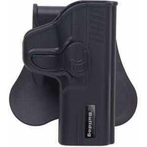 Bulldog's Rapid Release Holster is suitable for civilian, duty and military use. The holster is made of durable, high-tech polymer material with gun-specific design that is fully adjustable to multiple draw positions. Its specially designed locking mechanism provides safe and secure "Level II" retention while offering a one finger "Quick Draw" release.