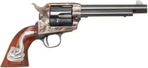 Another favorite introduced by Cimarron Fire Arms and produced by Pietta of Italy this peacemaker lookalike continues in the tradition of the spaghetti westerns of the 1960s. This single-action revolver replicates the distinctive hogleg packed by the mysterious drifter who brought his deadly justice to the frontier in such movie classics as A Fist Full of Dollars and For a Few Dollars More. More than just another single-action clone the Man With No Name SAA sports the traditional blue and color cased finish but has the addition of the deadly gunfighter's signature sterling silver coiled and ready to strike rattlesnake on the period varnished walnut grips. Offered in traditional 4 3/4-inch and 5 1/2-inch barrels this .45 Colt revolver could earn you a fist full of dollars at your next shootout! - Caliber: 45LC - Finish: Blue - Action: Single Action - Grip: Walnut 1 Piece with Inlaid Snake - Sight: Fixed - Barrel Length: 5.5 - Capacity: 6 - Frame: Case Colored Frame