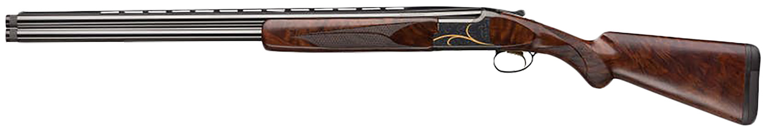 The Citori Gran Lightning's Grade V/VI walnut and detailed gold-accented engraving set the Gran Lightning apart from all other Citori Lightning variants. The rounded pistol grip allows the shooter to position his hand at the same, solid place for each shot, thus offering better control for fast-flying waterfowl, upland game, sporting clays or skeet. Matching the rounded pistol grip is the forearm. Features intricate, broad coverage engraving; Inertia trigger; hammer ejectors and chrome chambers. Includes three Standard Invector choke tubes and flat wrench.