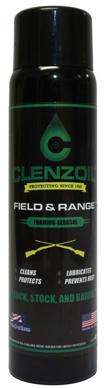 Clenzoil Field & Range Foaming Aerosol is a high quality, one-step cleaner, lubricant, protectant and rust inhibitor for Lock, Stock, and Barrel. It effectively removes oils, copper, lead, and other contaminants. It provides a thin, non-greasy coating that prevents rust and lubricates all moving parts of firearms and sporting equipment. Clenzoil will not harm polymers or other synthetic surfaces. This proprietary foaming aerosol does not use flammable or moisture laden propellants. The unique dual-purpose vortex spray head can apply a consistent surface coating when sprayed from a distance of 4-6". When applied from a distance of 2" or less, the product will foam into a thick lather that will work its way into small hard to reach areas, lifting and separating grime and other contaminants from the surface. Not recommended for painted surfaces.