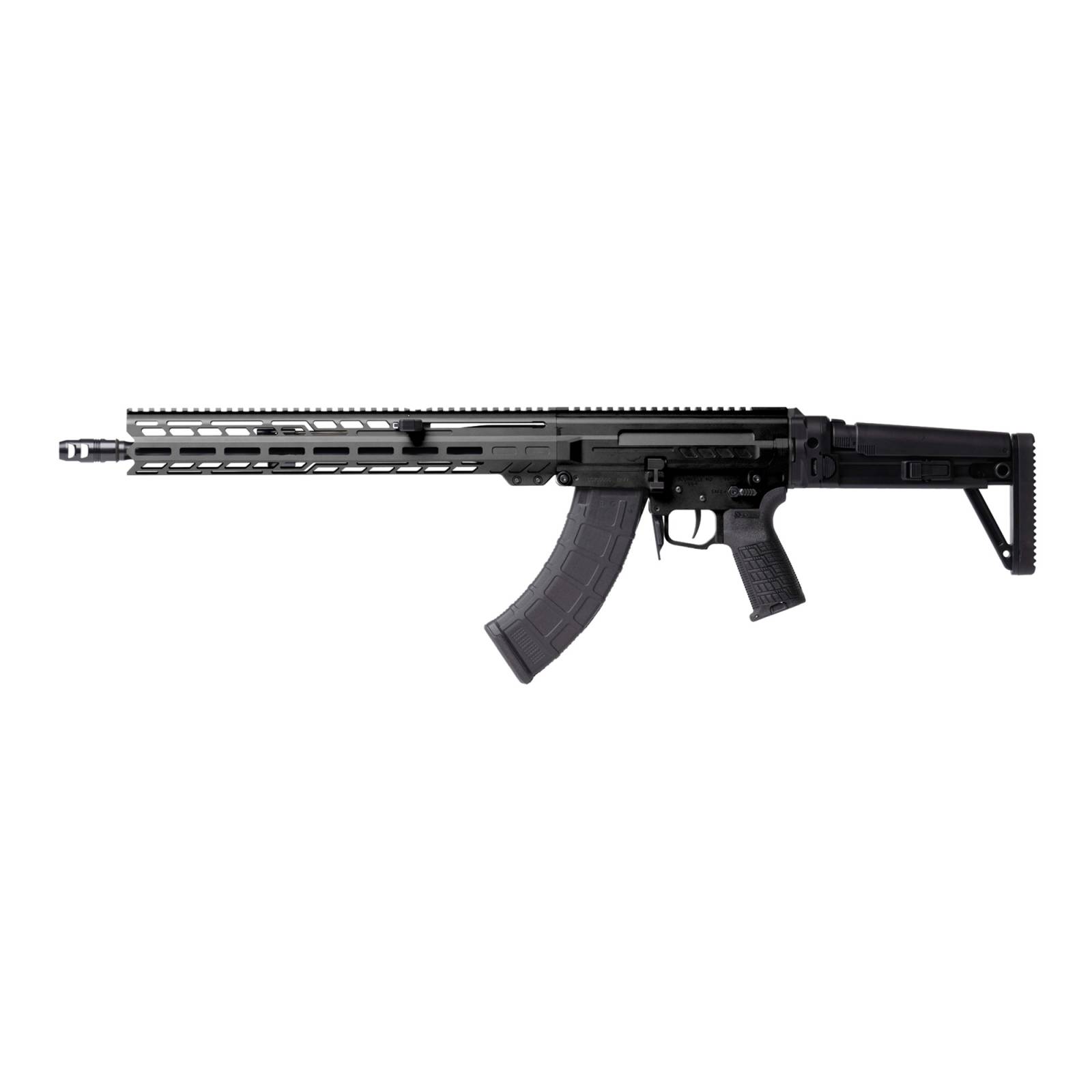 CMMG, DISSENT MK47, Semi-automatic Rifle, 7.62X39mm, 16.1" Medium Taper Threaded Barrel, ZEROED 308 Muzzle Brake, Cerakote Finish, Armor Black, Free Float M-LOK Handguard, DISSENT Side Folding Stock, Manual Safety, 30 Rounds, 2 Magazines
