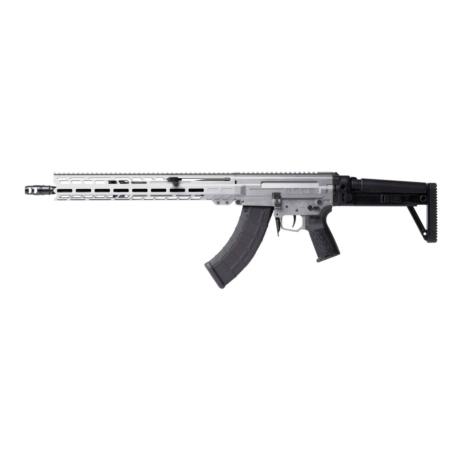 CMMG, DISSENT MK47, Semi-automatic Rifle, 7.62X39mm, 16.1" Medium Taper Threaded Barrel, ZEROED 308 Muzzle Brake, Cerakote Finish, Tungsten, Free Float M-LOK Handguard, DISSENT Side Folding Stock, Manual Safety, 30 Rounds, 2 Magazines