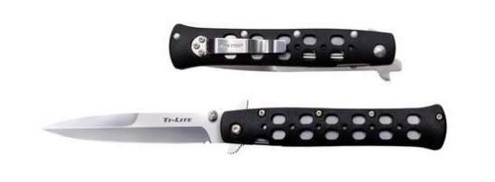 Reminiscent of the sleek speed of 1950s-styled switchblades, this Ti-Lite tactical folder, unlike most switchblades, is legal to carry almost everywhere. Ti-Lites can be opened rapidly by using the thumb studs or by snagging a quillon on the edge of your pocket as you draw the knife. The leaf spring lock and liner is made of high quality stainless steel. The AUS 8A stainless steel blade is 3mm thick with a razor sharp edge, with sturdy, needle sharp point and a black, Zytel handle.