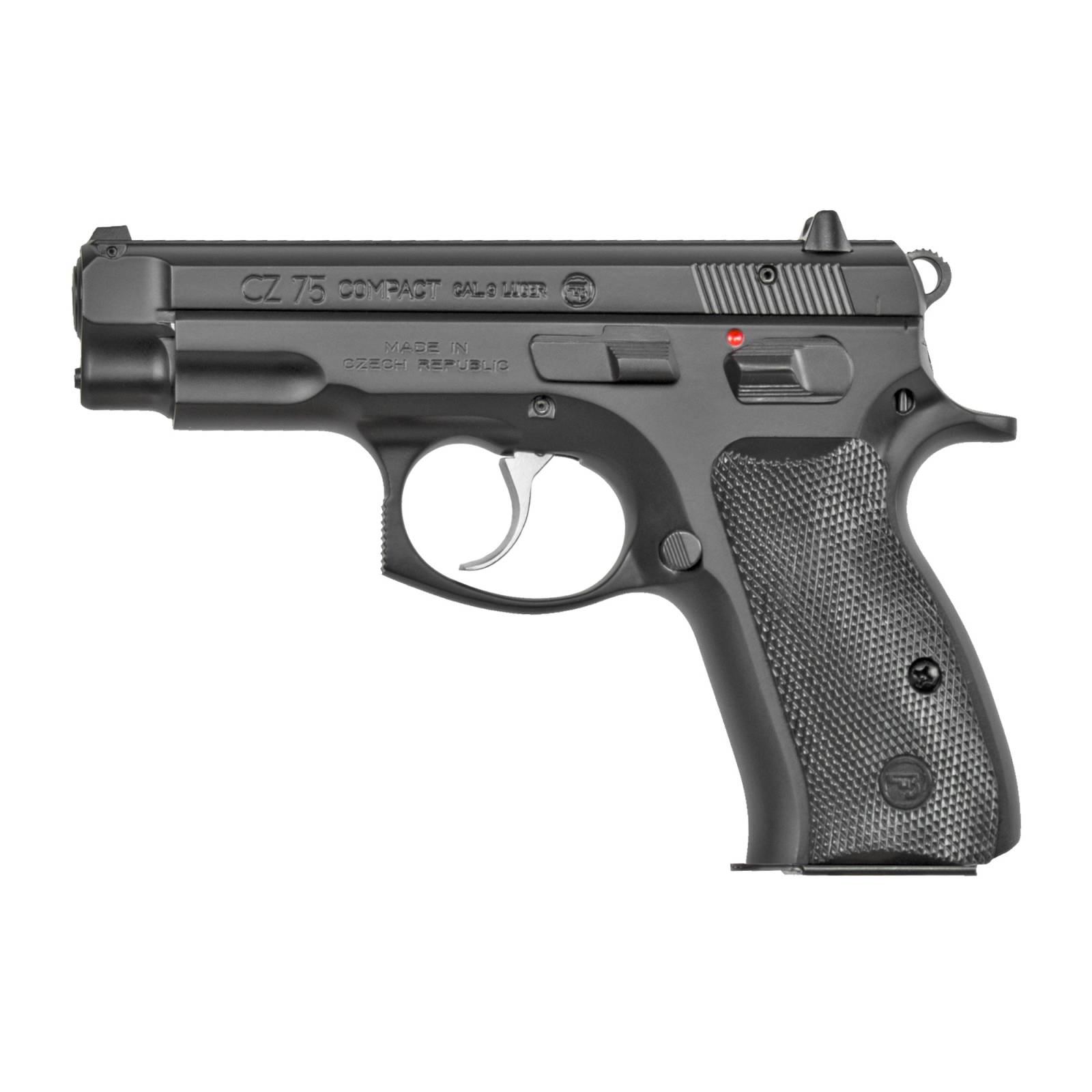 CZ, 75 Compact, Double Action/Single Action, Semi-automatic, Metal Frame Pistol, Compact, 9MM, 3.75" Cold Hammer Forged Barrel, Black, Plastic Grips, Fixed Sights, 15 Rounds, 2 Magazines