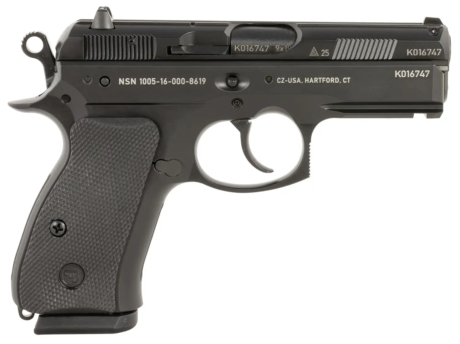 The 50th Anniversary models features "50th Anniversary logo" engraved on the frame. The CZ P-01 is a compact, aluminum-framed 9mm designed for LE and Military duty, but its compact size and the reduced weight due to its forged alloy frame make it ideal for discrete carry as well. Equipped with a decocker, the P-01 is convenient for those who prefer hammer-down carry. With a heavy first-round trigger pull, any additional shots are a light, crisp single action. The components of the P-01/P-06 are completely interchangeable with every other P-01/P-06, with no individual fitting needed. Features an integral accessory rail on its dust cover; cold hammer forged barrel; rubber grips; fixed sights and a decocking lever, safety stop on hammer, firing pin block safety.