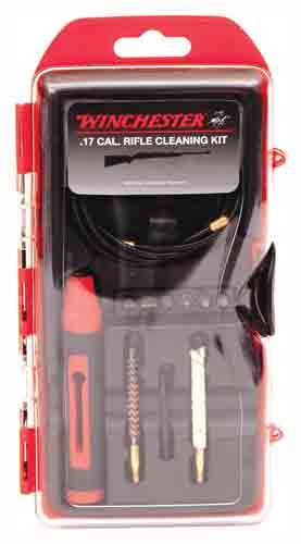 This Winchester 17 caliber 12 piece rifle cleaning kit Includes: Red Winchester case, hybrid multi-function handle, 33" pull rod, 17 cal. brush, 17 cal. mop, 17 cal. slot tip, 25 patches, 6 piece bit set (2 phillips, 2 flat heads, one star and one hex).