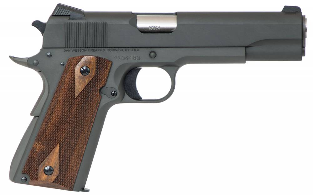 Dan Wesson uses the best components and finishes the industry has to offer creating the best possible 1911. The 1911 A2 is DW's vision of what the 3rd generation of a military 1911 could have looked like. Starting with a forged steel frame and slide, the A2 is built using top-shelf parts. It features a lowered and flared ejection port, modern combat sights, tactical beavertail and an extended thumb safety as well as a hint of undercutting the trigger guard. The double diamond walnut grips give it a classic look while the stainless steel match barrel and tight slide-to-frame fit ensure that it's no slouch in the accuracy department. This model has a 5" barrel with a black parkerized finish and fixed front sights.