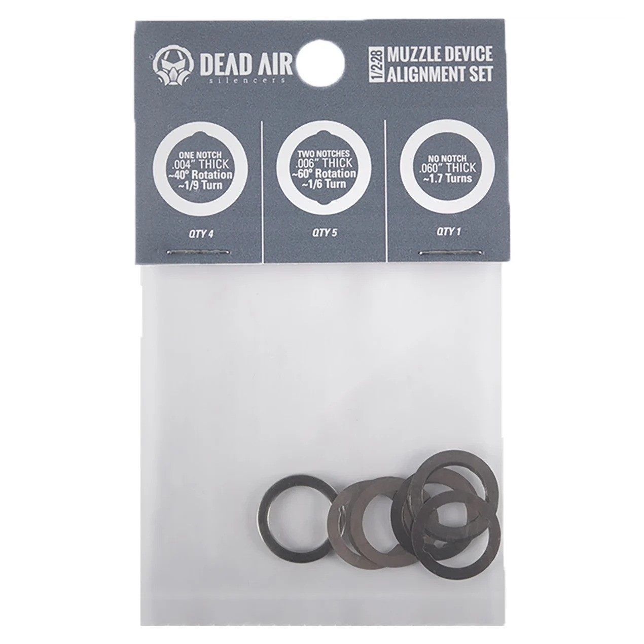 The Dead Air Shim Kit for barrels with 1/2-28 threads is composed of three different shim thicknesses. The graphic on the packaging details the thicknesses and identifying features of the shims included with the kit. Always place the thickest shim(s) on the barrel first.