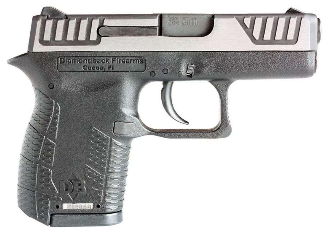 Diamondback's DB380 lightweight micro-compact pistol made entirely in the USA. Designed with safety in mind, the DB380 features a "ZERO-Energy" striker firing system with a mechanical firing pin block. It also has a steel magazine catch and real windage-adjustable sights. The steel trigger with dual connecting bars allows for a crisp smooth, trigger pull, while the FEA (Finite Element Analysis) designed slide and barrel is stronger than any comparable firearm. The slide, barrel, and internal parts features a corrosion resistant coating, making this pistol a lifetime investment. This model has a 2" barrel and a black frame with silver slide.