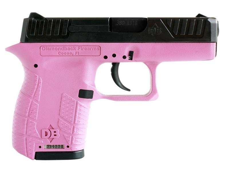 Diamondback's DB380 lightweight micro-compact pistol made entirely in the USA. Designed with safety in mind, the DB380 features a "ZERO-Energy" striker firing system with a mechanical firing pin block. It also has a steel magazine catch and real windage-adjustable sights. The steel trigger with dual connecting bars allows for a crisp smooth, trigger pull, while the FEA (Finite Element Analysis) designed slide and barrel is stronger than any comparable firearm. The slide, barrel, and internal parts features a corrosion resistant coating, making this pistol a lifetime investment. This model has a 2" barrel and a hot pink frame with black slide.