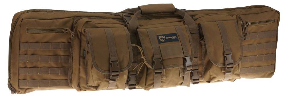 Drago Gear gun cases are designed to optimally secure and protect long guns, and come equipped with multiple storage areas to efficiently organize ammunition and accessories. These gun cases have padded backpack straps for hands-free transport, three large storage pouches for ammunition and accessories, four zippered storage areas, and two padded pistol pouches. MOLLE front panels allow attachment of load-bearing equipment. This water-resistant case is made of 600D polyester. This 42" double gun case has a thick, padded divider to help protect gun optics and a tan finish.