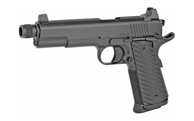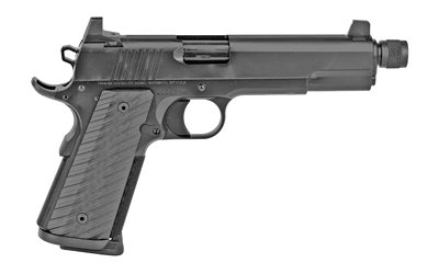 The Wraith is a threaded Government-size 1911 that wears a solid blacked out finish on top of a stainless steel construction. Some grippy stippled G10 grips are cut short to accommodate a magwell, and the slide wears a set of high night sights.