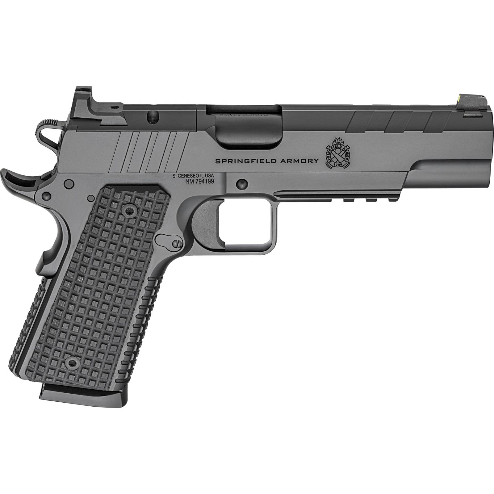 Springfield, Emissary AOS, 1911, Single Action Only, Semi-automatic, Full Size, 45 ACP, 5" Match Grade Bull Barrel, Stainless Steel Frame and Carbon Steel Slide, Cerakote Finish, Black, Optics Ready, VA Grips Thin-Line G10, Manual Thumb Safety, Tritium/Luminescent Front Sight, Tactical Rack U-Notch Rear Sight, 8 Rounds, 2 Magazines