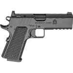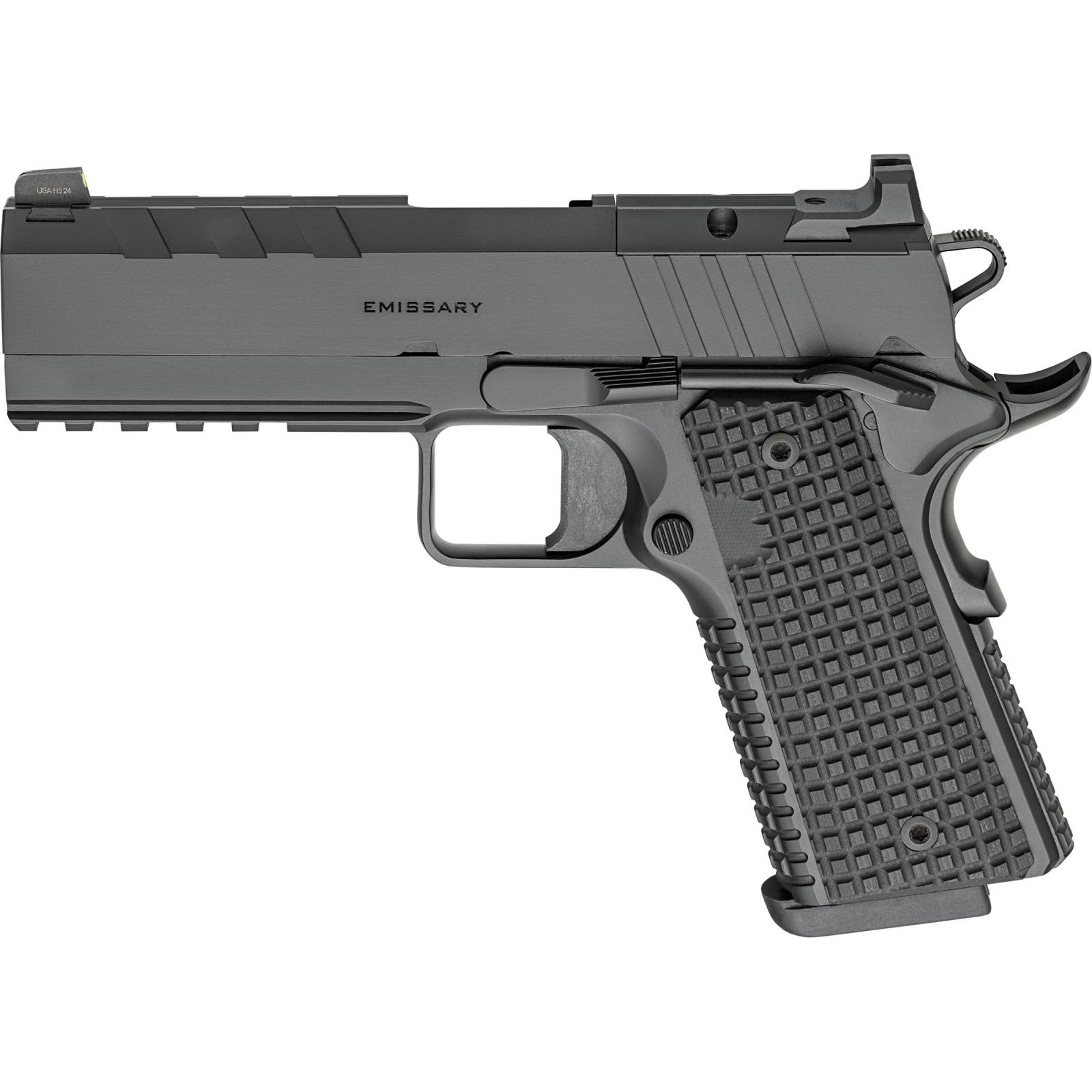 Springfield, Emissary AOS, 1911, Single Action Only, Semi-automatic, Commander Size, 9MM, 4.25" Match Grade Bull Barrel, Stainless Steel Frame and Carbon Steel Slide, Cerakote Finish, Black, Optics Ready, VZ GripsThin-Line G10, Manual Thumb Safety, Tritium/Luminsescent Front Sight, Tactical Rack U-Notch Rear Sight, 9 Rounds, 2 Magazines