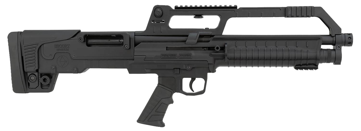 The Escort BullTac semi-auto shotgun is a sporting, security and law enforcement companion. The purpose-built bullpup shotgun features an 18" barrel for shot or slugs; synthetic stock; side accessory rails on the carry handle; Picatinny optics rail; detachable carry handle; adjustable rear sight, fixed front sight; QD sling mount; Fixed cylinder choke and manual cross button safety.