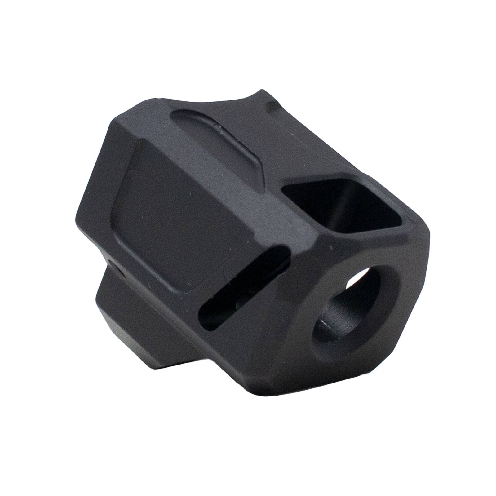 Constructed of 6061 Aluminum with a black anodized finish, Faxon Pistol Compensators feature a uniquely angled front port single chamber design, enabling the compensator to improve consistency while reducing muzzle climb and recoil. The angled ports allow gas to deflect upwards as opposed to only deflecting sideways, reducing up and down muzzle movement and improving reliability. Barrel protrusion is designed to fit flush with the slide and has been optimized for Faxon branded barrels. For all other barrels, the barrel should protrude .600" or less for a flush fit. Each compensator comes complete with thread locker, two 6-32 set screws, and a 1/16 Allen wrench.