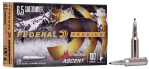 Any hunt. Any range. Go beyond what you ever thought possible with Federal Premium Terminal Ascent. Bonded construction penetrates deep on close targets,while the patented Slipstream polymer tip initiates expansion at velocities 200 fps lower than comparable designs. The bullets long, sleek profile offers an extremely high ballistic coefficient, and its AccuChannel groove technology improves accuracy and minimizes drag.