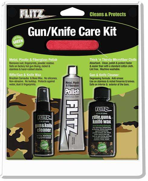 The Gun/Knife Care Kit is exactly what you need to clean, polish and protect your knives, guns, and swords. The Gun/Knife Cleaner has an anti-smear degreasing formula safe for use on stainless steel and nickel as well as on the interior and exterior of the bore. The Gun and Knife wax features a water-based white carnauba and beeswax formula that contains no solvents, and provides exceptional results on gunblueing, polished or hand-rubbed stocks, stainless and nickel firearms. It removes and protects against rust, fingerprints, water stains, powder residue, blood, and more while remaining safe to the interior and exterior of the bore. It adds UV and acid rain protection, won't attract dust or wash off in rain, and protects up to six months. Flitz Metal Polish cleans stainless, nickel or HOT BLUED guns and knives, removing powder residue, fingerprints, rust, and more without harming the surface. This kit contains: (1) Flitz Gun & Knife Cleaner 1.7oz, (1) Flitz Polish-Paste 1.7oz, (1) Flitz Rifle Gun & Knife Wax Protectant 1.7oz, and a 16"x16" Premium Microfiber Cloth.