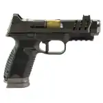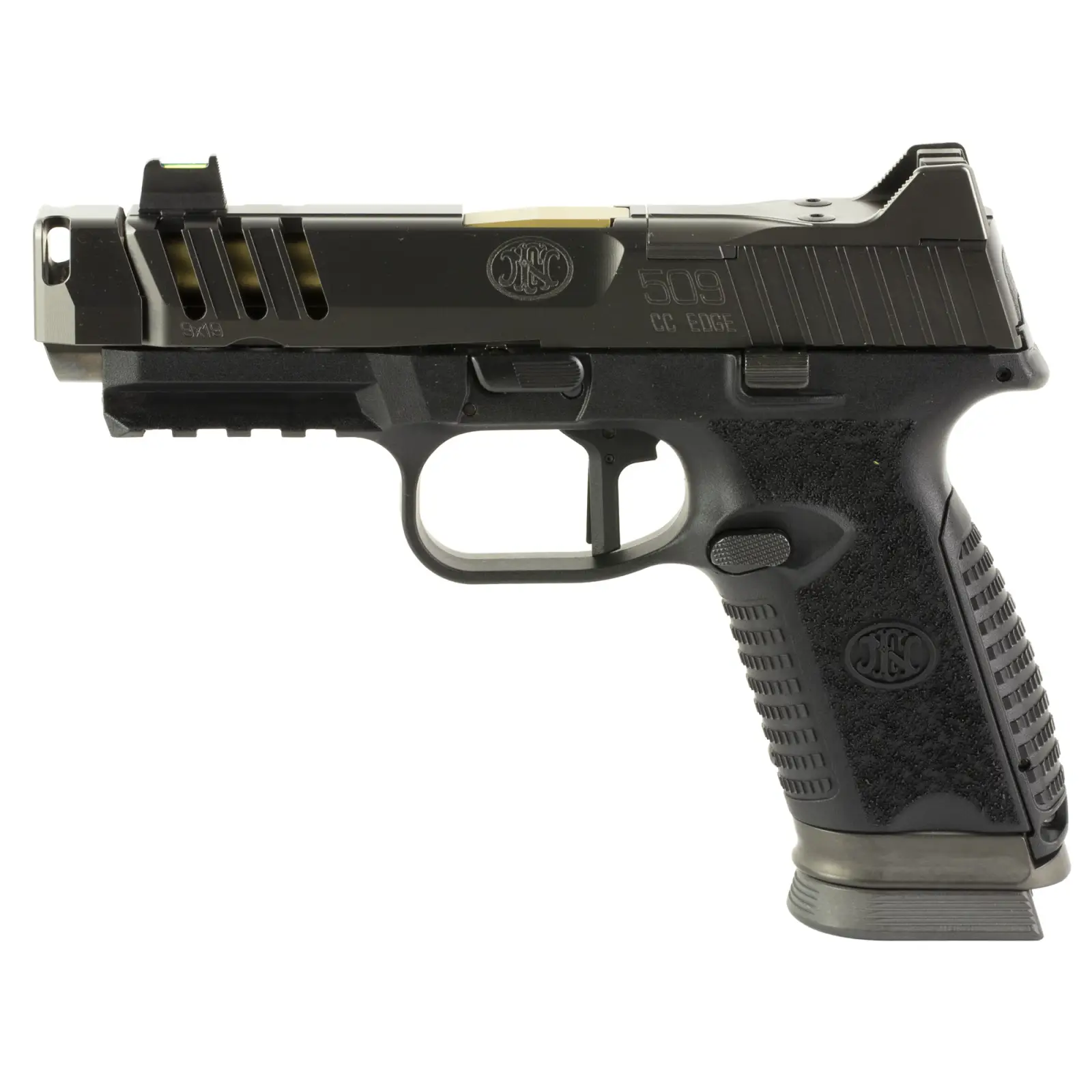 FN America, 509 CC Edge XL, Striker Fired, Semi-automatic, Polymer Framed Pistol, Compact, 9MM, Gold TiN 4.2" Barrel, Quick Detach Compensator, PVD Finish, Graphite Slide, Black Frame, Flat Face Trigger, Flared Magazine Well, Fiber Optic Front Sight, 17 Rounds, 3 Magazines