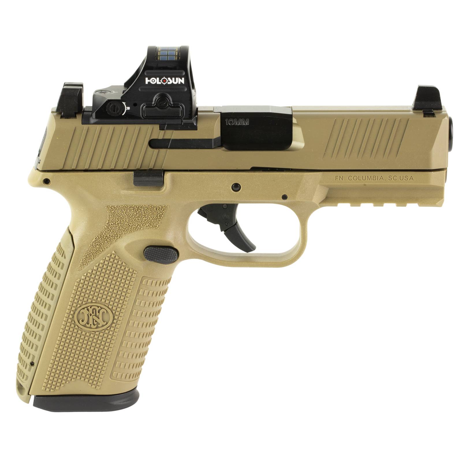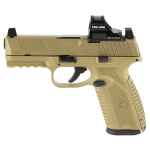 FN America, 510 MRD, Striker Fired, Semi-automatic, Polymer Frame Pistol, Mid-Size, 10MM, 4.1" Barrel, Matte Finish, Flat Dark Earth, Inlcudes Holosun 407C Red Dot Sight, Non-Manual Safety, Optic Height Sights, 15 Rounds, 2 Magazines