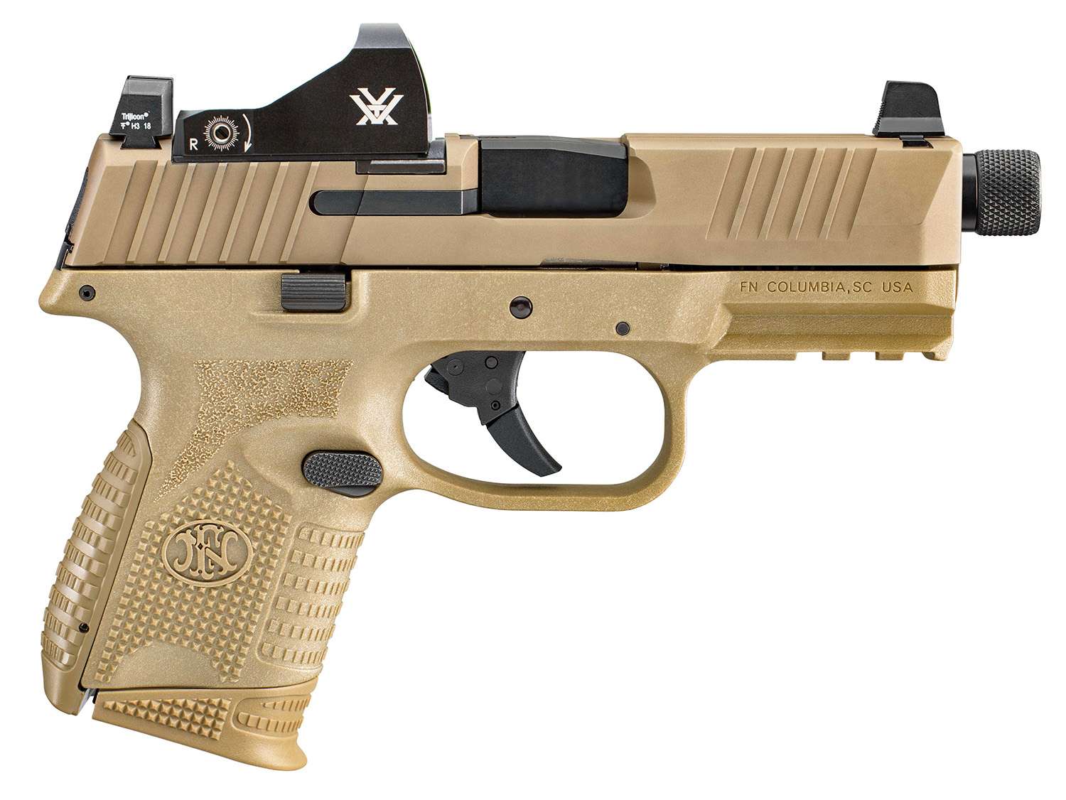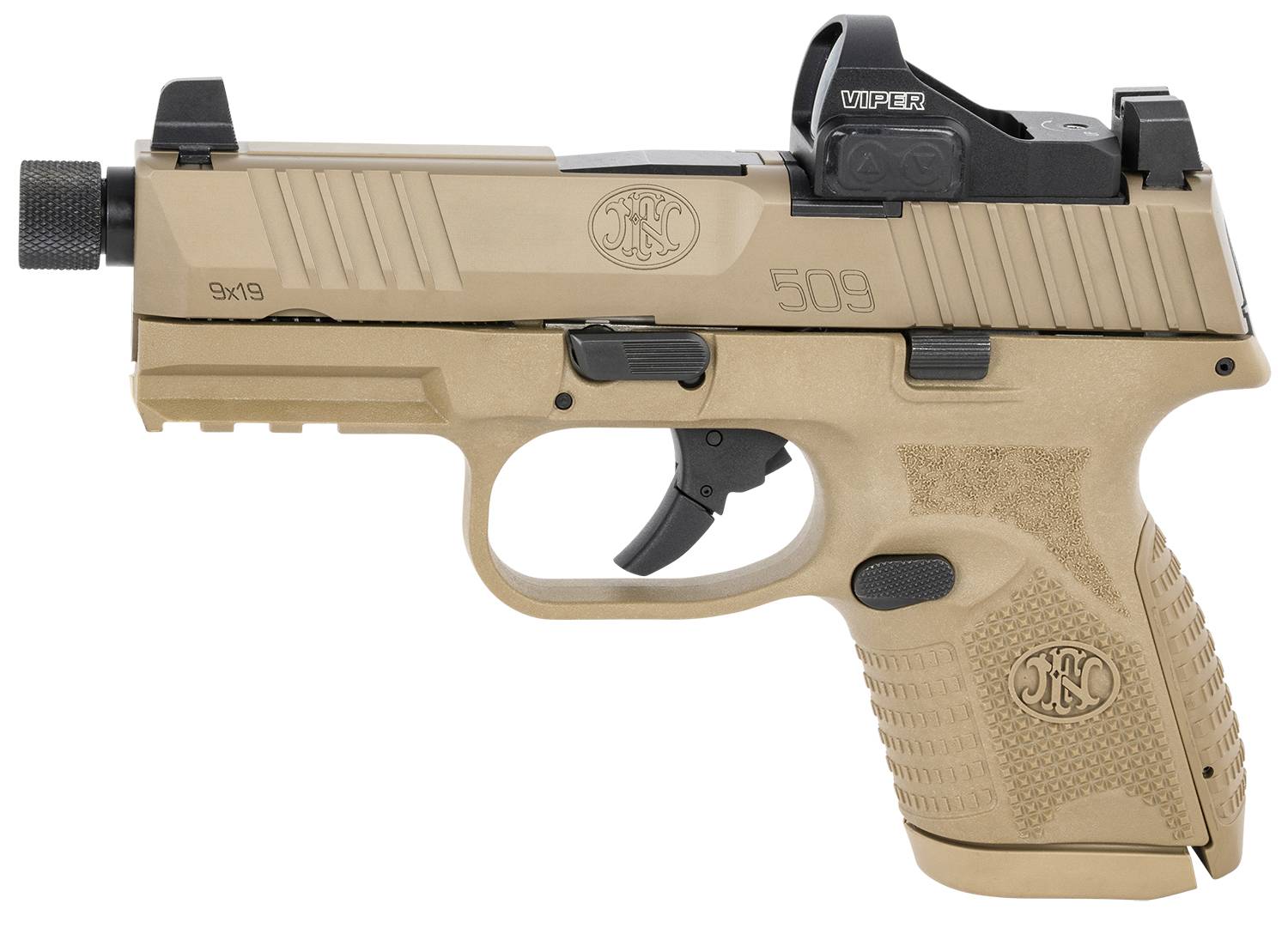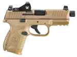 The FN 509 Compact Tactical is easily deployed as an everyday carry. The pistol features the FN Low-Profile Optics Mounting System that accepts nearly all commercial miniature red dot optics; blackout iron sights that co-witness; cold hammer-forged threaded barrel compatible with most popular aftermarket accessories like compensators or suppressors; interchangeable backstraps; Picatinny rail; fully ambidextrous slide stop lever and magazine release. Includes a Viper red Dot, two magazines, two interchangeable backstraps, locking device and soft case.