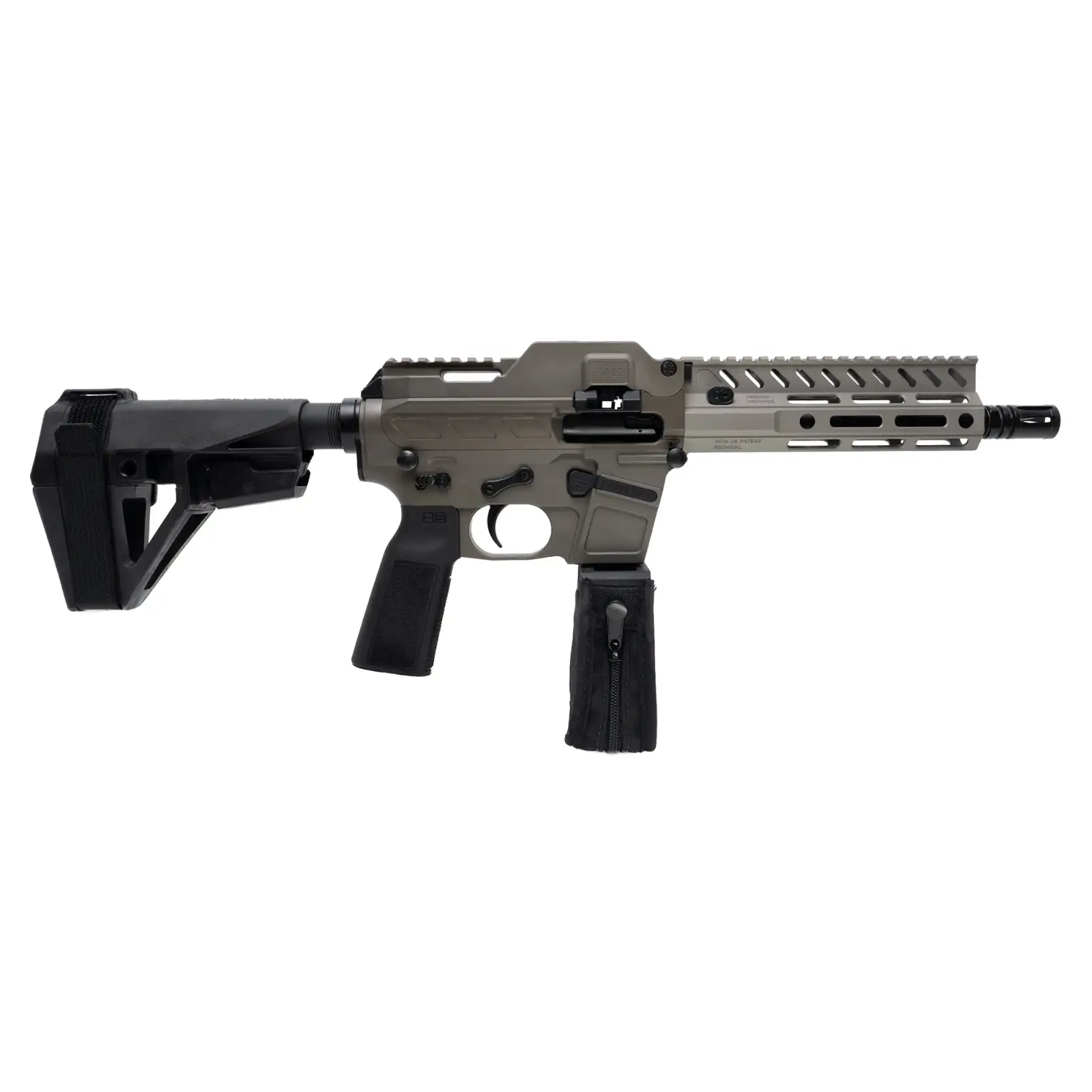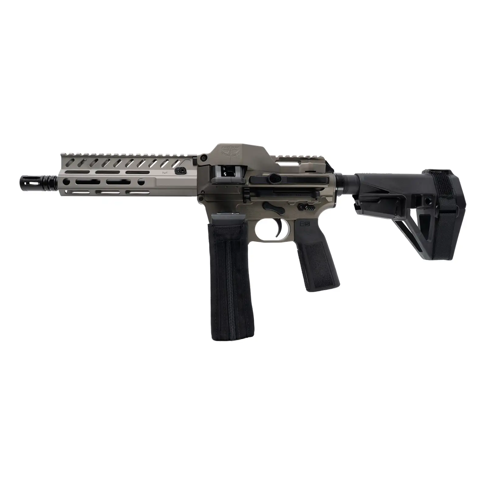 Freedom Ordnance FM-9D, Semi-automatic, Belt Fed Pistol, 9MM, 8" Barrel, A2 Flash Hider, Anodized Finish, Flat Dark Earth, Manual Safety, SBA5 Pistol Brace, M-LOK Handguard, 33 Rounds, 1 Glock Magazine, 150 Links, 100 Round Bag, Soft Case FM9D8M-FDE