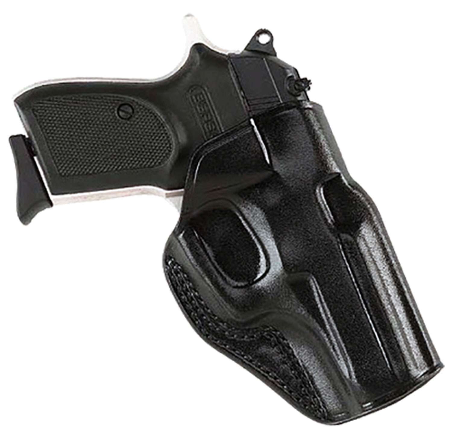 Galco's Stinger Belt Holster is made to carry a small semi-automatic pistol behind the strongside hip. It has an open top and forward cant which will allow a fast, easy draw stroke. Safety, security, and stealth are all addressed with a covered trigger guard, deep molding, and a tunnel-style belt loop that takes up little belt space compared to a normal pancake-type holster. The Stinger is constructed of black premium saddle leather and fits belts up to 1.5" wide.