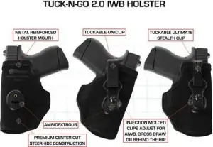 The Tuck-N-Go 2.0 is made of center cut steerhide, while the metal reinforced mouth allows a smooth and easy return to the holster. The ambidextrous Tuck-N-Go 2.0 is supplied with two types of interchangeable tuckable clips. The first is the UniClip, designed to go over the belt, but also works well without a belt. The second is the Ultimate Stealth clip with hook, which fits on the trouser waistband, under or behind a belt with just the clip showing, for concealment. The Tuck-N-Go 2.0's belt clips are adjustable for cant, making it suitable for the strongside, crossdraw or appendix carry positions. The UniClip fits belts up to 1.5", the Ultimate Stealth clip fits belts of unlimited width.