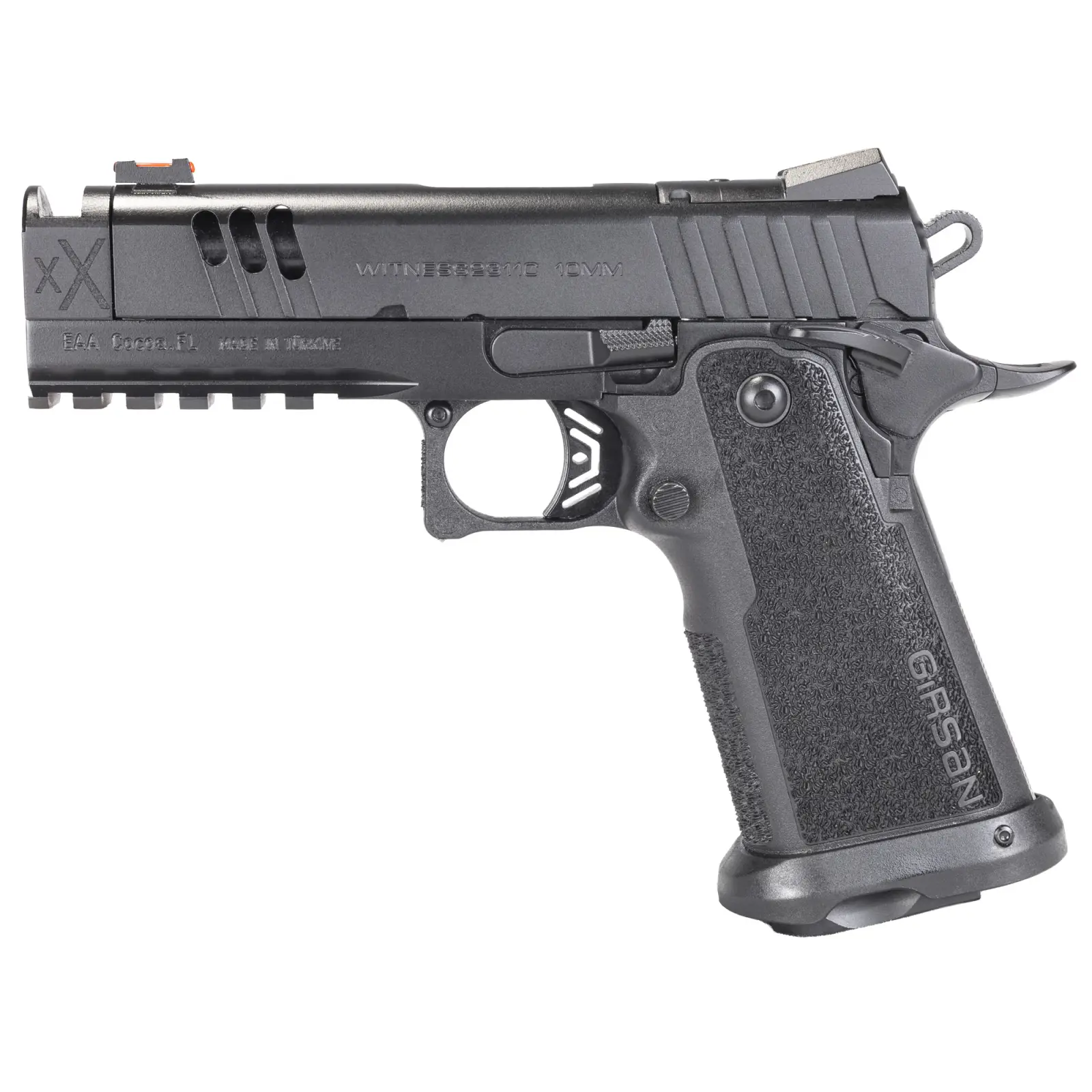 Girsan, Witness 2311 Match XX, Semi-automatic, Single Action Only, Metal Frame Pistol, Full Size, 10MM, 4.25" Integrally Compensated Barrel, Cerakote Finish, Black, Optics Ready, RMSc Footprint, Fiber Optic Front Sight, Magwell, 15 Rounds, 1 Magazine